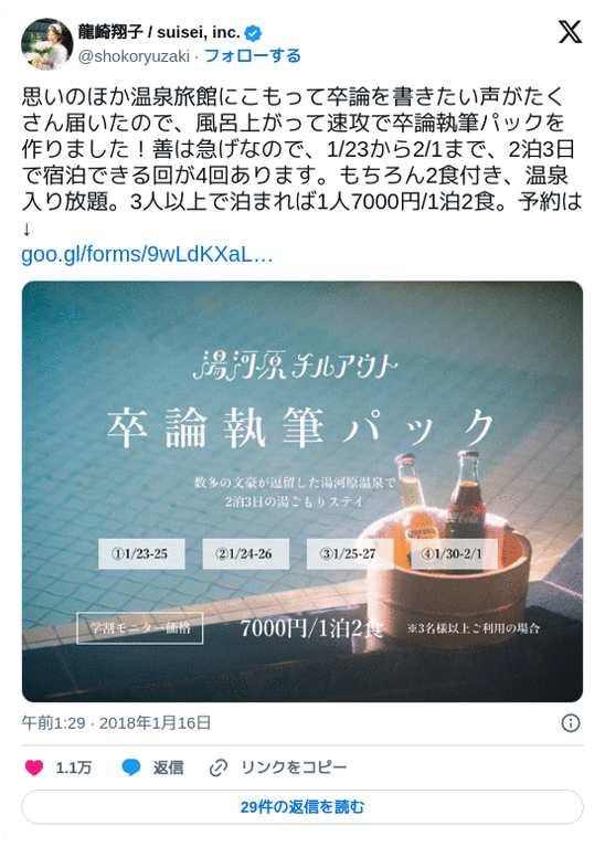私はお風呂でアイデアが浮かぶことが多いんです。5年以上前になりますが、湯河原の温泉旅館を運営していた時、稼働が低い時期の平日にどうやったら学生が来てくれるかということを考えていたんです。温泉旅館にこもって卒論を書いてもらえないかと思いながら、旅館の大浴場でお風呂に浸かりながら考えてみると、みるみる構想がまとまって、お風呂上がりにそのまま企画をまとめてプランをリリースしました。それがこれまでで一番売れたプランになりました。