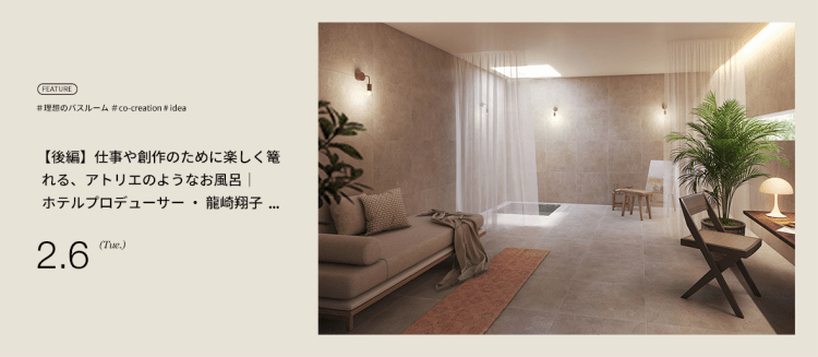 前半では龍崎さんのお風呂にまつわる体験を中心に、ホテルプロデューサーならではの視点でのお話を伺いました。後半の記事では、龍崎さんとともにより具体的な理想のお風呂を考えながら、アイデアを具体的なイメージにしてみたいと思います。ぜひ、お楽しみに。