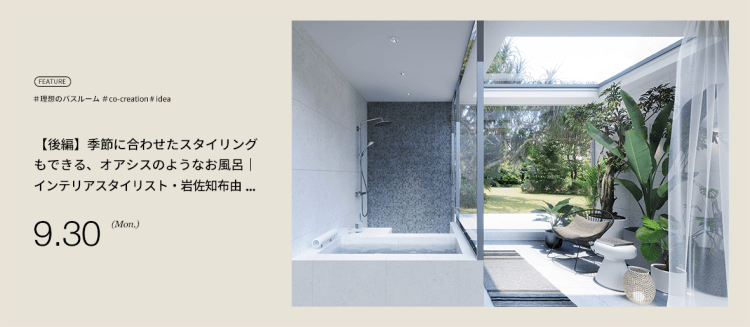 前半では岩佐さんのお風呂にまつわる体験を中心に、インテリアスタイリストならではの視点でのお話を伺いました。後半の記事では、岩佐さんとともにより具体的な理想のお風呂を考えながら、アイデアを具体的なイメージにしてみたいと思います。ぜひ、お楽しみに。