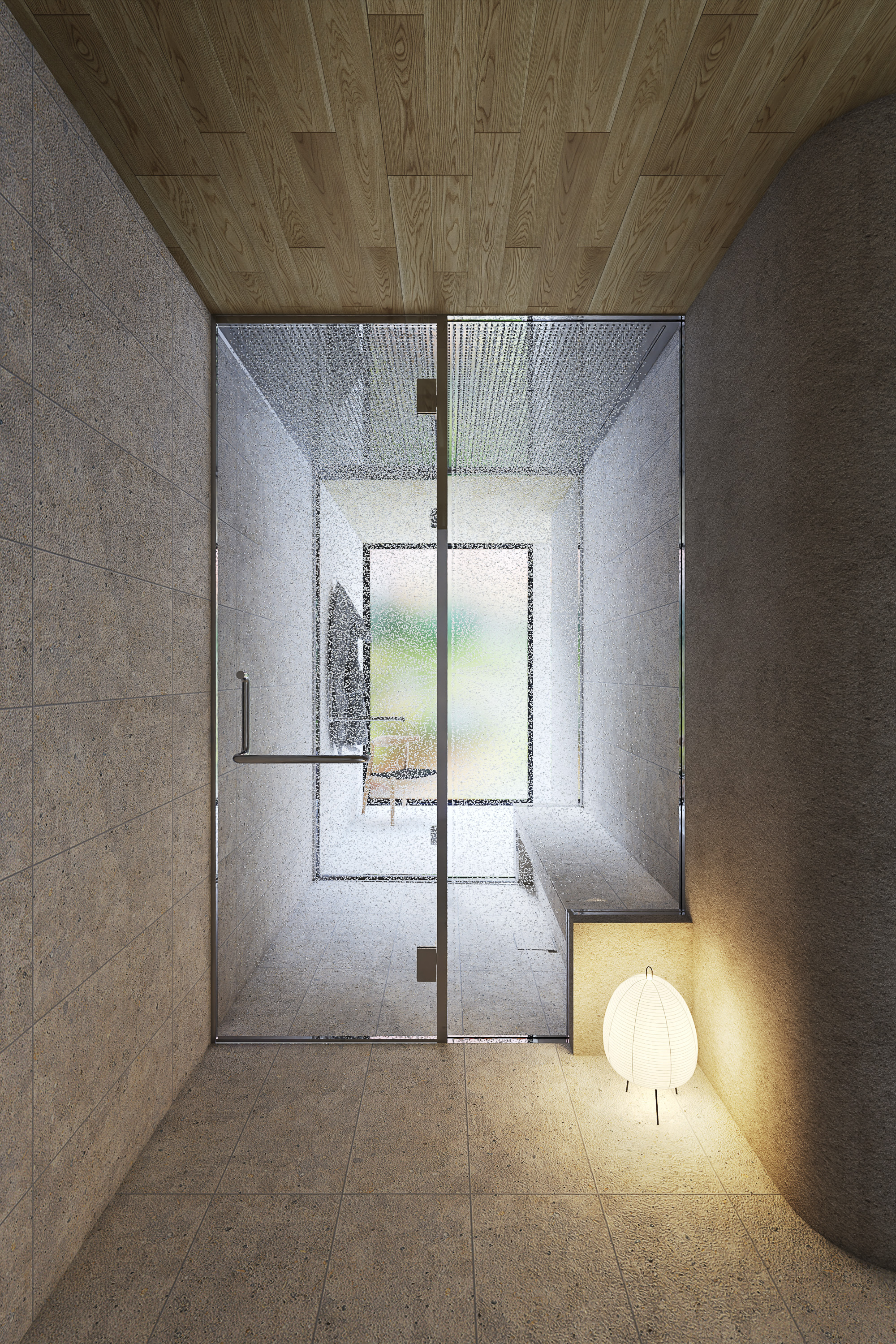 まず1つ目は、私の習慣になっている朝用のシャワー空間です。1日の始まりと終わりにすぐ入れるように、本当は玄関入ってすぐの場所にシャワー室を作りたいぐらいなんです。雨の中や滝の中にいるような、天井全体からシャワーが降ってくる空間だと理想ですね。5分くらい水の音に耳を澄まして、自分を覚醒させるための空間です。